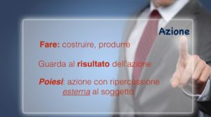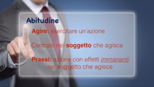 1. Agire– significa “esercitare un’azione”, ed è centrato nel soggetto che agisce. Non è un generico fare; aggiunge qualche azione di personale. E’ un “fare attivamente, muoversi” . Corrisponde al termine greco prassi, cioè un’azione con effetti immanenti nel soggetto. Qui l’accento è non tanto sull’azione come sul soggetto che agisce. Soggetto che viene in un certo senso trasformato dall’azione che realizza. Dopo “agire” sei diventato più bravo, più efficace, più competente, più preparato, più intraprendente, o più (purtroppo non sempre va in senso positivo) egoista, meno fiducioso… E questo succede perché il susseguirsi di azioni, creano un abito, una tendenza ad operare, ad agire in un determinato modo. Tanto è cosi che con l’abitudine io dico di una persona che è brava, efficace, competente, preparata…, perché abitualmente realizza azioni che la qualificano in questo senso.